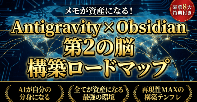 そんな虚しさを抱えていた僕に、「じゃあ、どうすればそのメモを『第2の脳』として機能させ、自分専用のAIに変えられるのか?」という明確な答えを示してくれたのが、今回紹介するリツトさんの教材『メモが資産になる|Antigravity × Obsidian で第2の脳を構築する完全ロードマップ』でした。