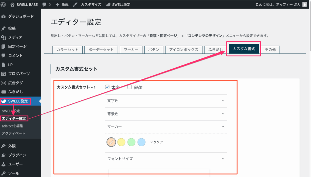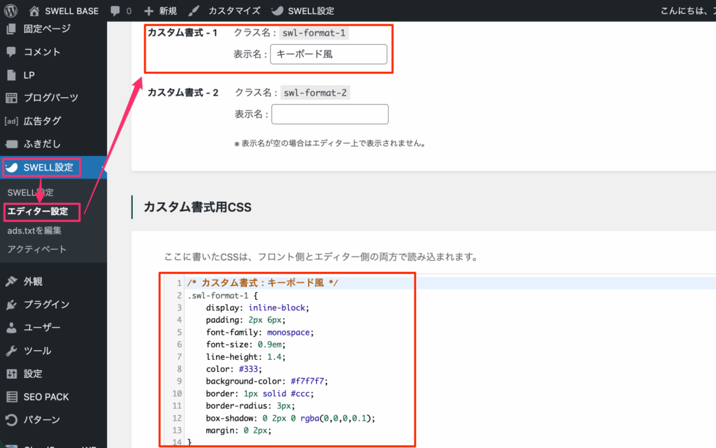 登録は、WordPressダッシュボードからSWEL設定➡️エディター設定➡️カスタム書式タブで行います。