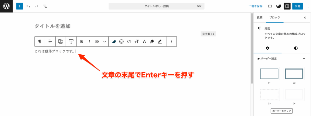 段落ブロック内の文章の末尾でEnterキーを押してみて下さい。