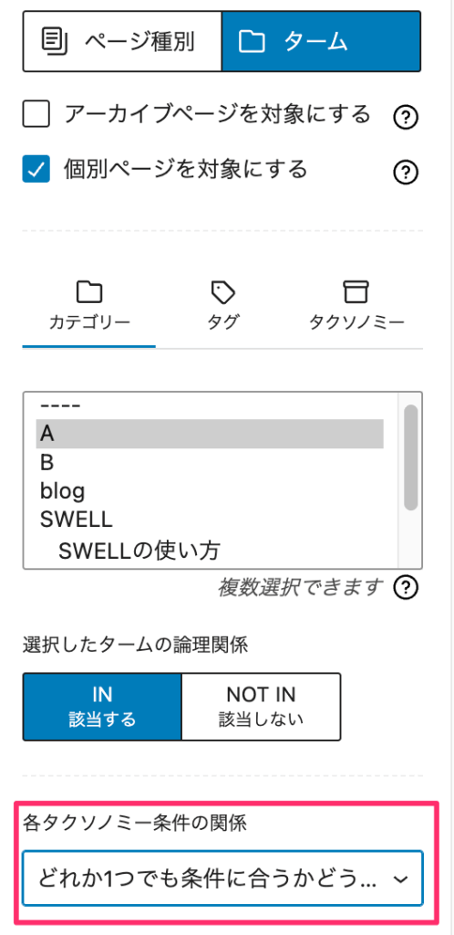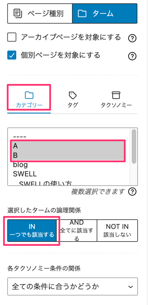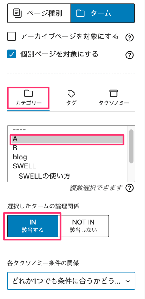 | ②カテゴリーがAまたはタグがXならば、投稿記事に表示する | |