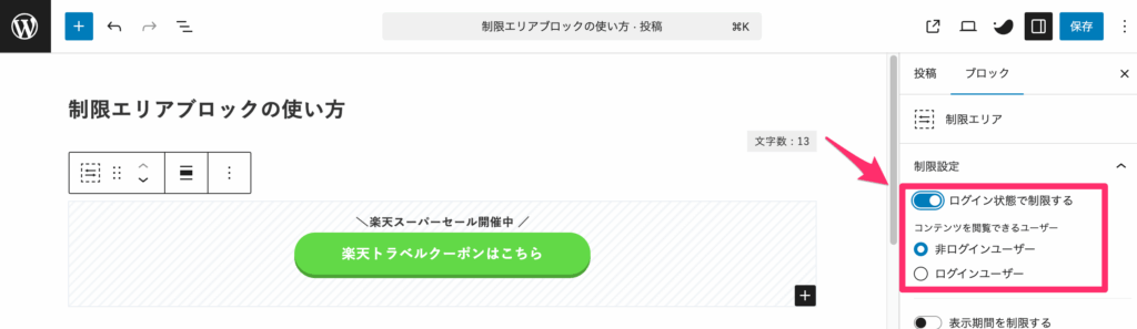 制限エリアブロックを選択した状態で、右側のサイドバーから「表示期間を制限する」のトグルをONにします。