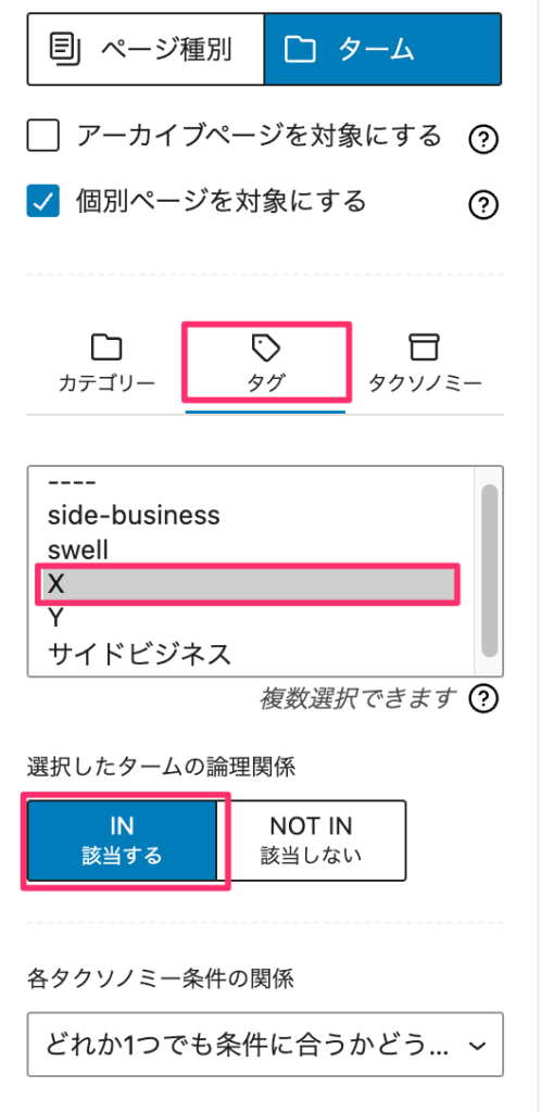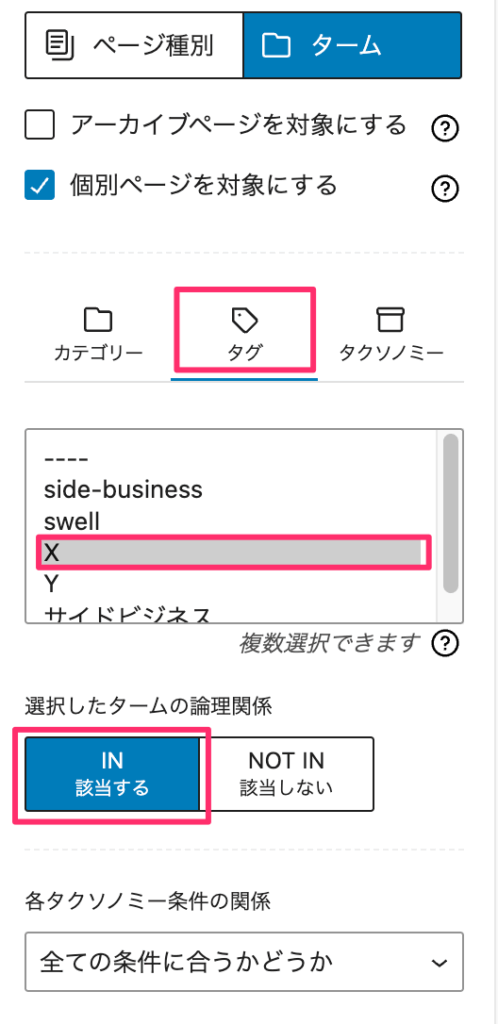 | タグはXを選択 | 関係設定:「IN(該当する)」 |
