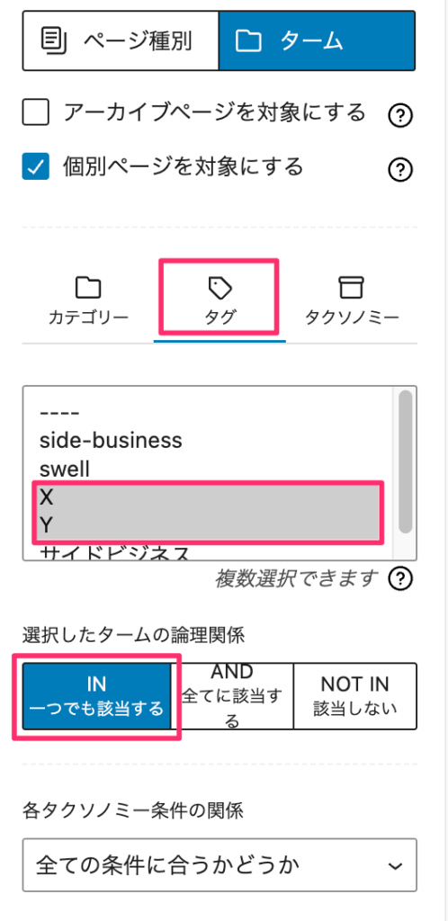 | タグはXとYを選択 | 関係設定:「IN(一つでも該当する)」 |