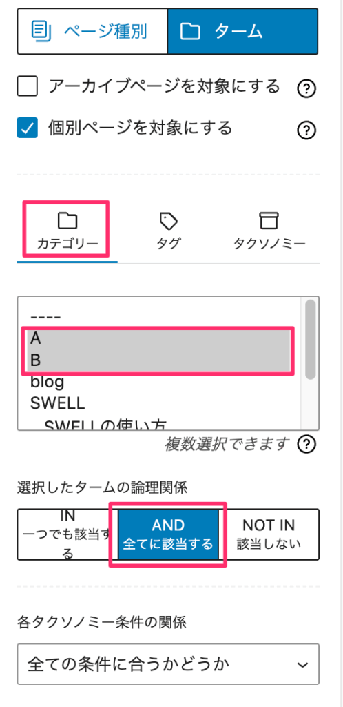 | カテゴリーはAとBを選択 | 関係設定:「AND (全てに該当する)」 |