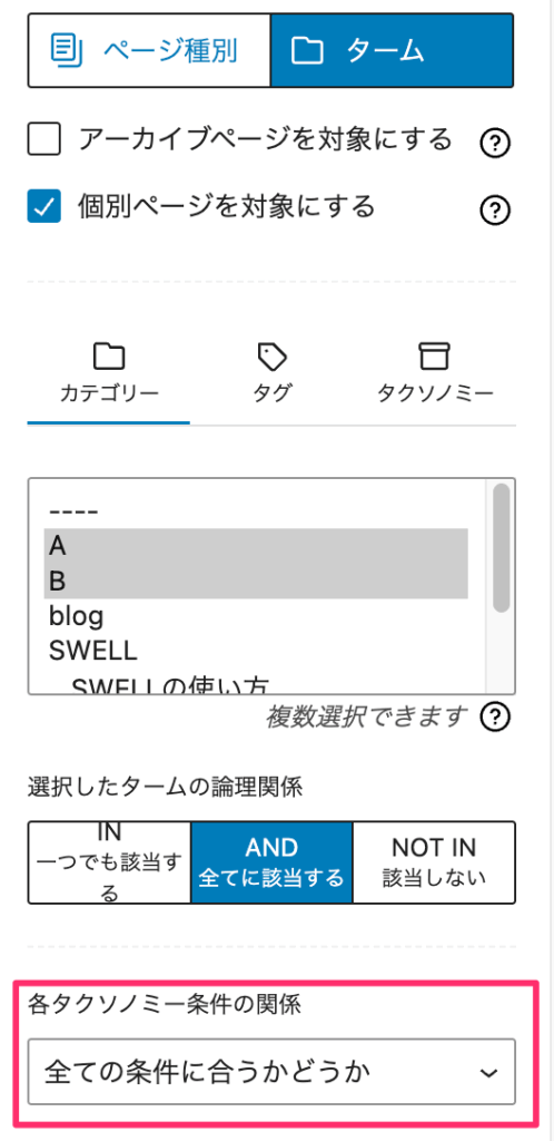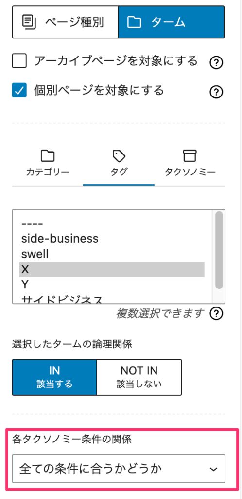 | ①カテゴリーがAまたはBで、かつタグがXの時だけ投稿記事に表示する | |