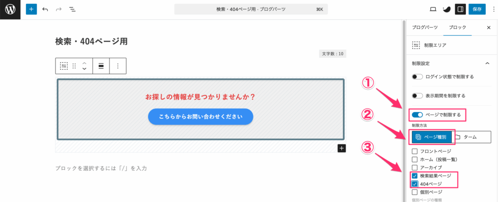 ①検索窓に「制限エリア」と入力すると、②制限エリアブロックが表示されるのでクリック。